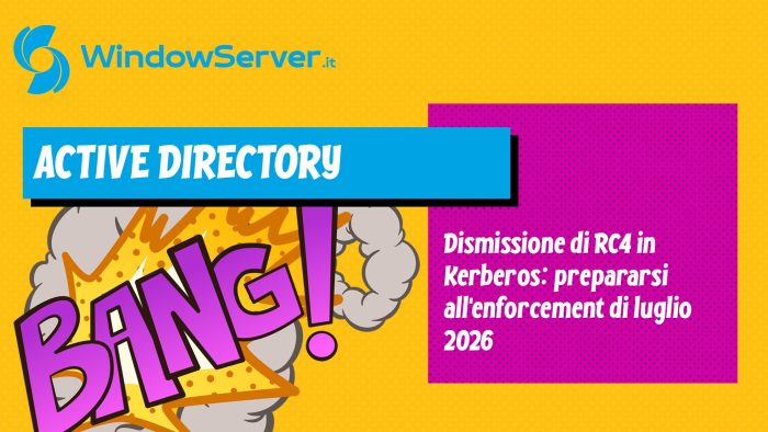 • Luglio 2026 — Fase di Enforcement definitivo. La chiave di registro RC4DefaultDisablementPhase viene ignorata dai Domain Controller aggiornati e la modalità audit non è più disponibile. RC4 continuerà a funzionare esclusivamente per gli account in cui è stato dichiarato esplicitamente nell’attributo msDS-SupportedEncryptionTypes. Dopo questa data non esiste più alcun meccanismo di fallback implicito